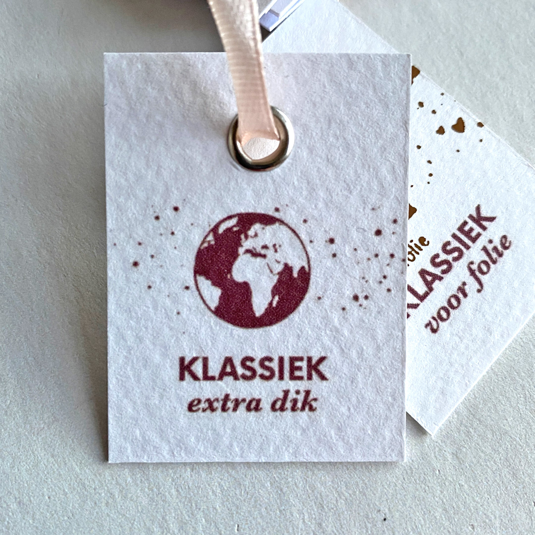 Voor trouwkaarten wordt over het algemeen vaak gekozen voor klassiek papier. Het is een papiersoort met klein wolkerige structuur en het is iets off-white als je het naast mat wit papier legt. De meeste trouwkaarten die nu voorbijkomen zijn vrij minimalistisch qua illustraties, waardoor er meer van het materiaal zichtbaar is. Daarom is het klassieke papier echt een mooie optie voor jullie trouwkaarten. Verder geldt eigen hetzelfde als voor de geboortekaartjes. Heb je illustraties/foto's met kleine fellere kleuren dan zou ik een mat wit papier aanraden en zachte/sfeervolle kleuren komen mooi uit op zijdeglans papier. Is jouw ontwerp bedoeld voor een menukaart? Kies dan voor een enkele kaart van Zijdeglans Extra dik papier; dit kan tegen een stootje en een drup.